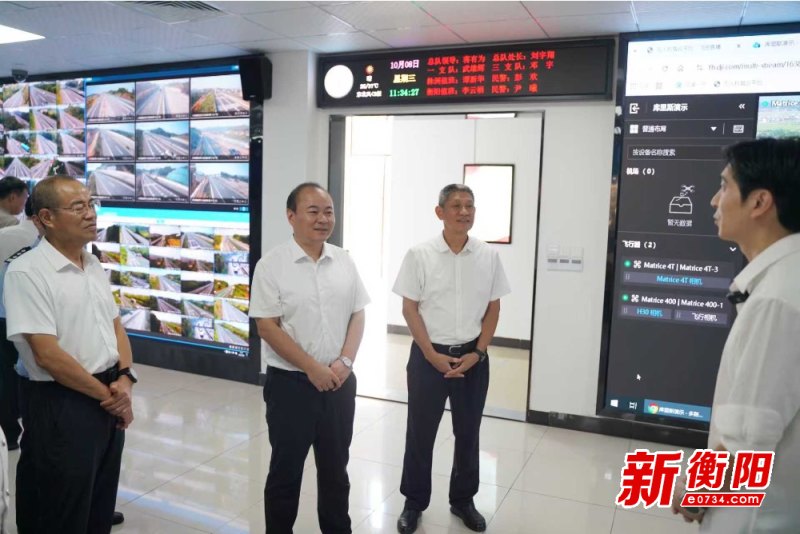 在高速交管三支隊指揮中心,朱健通過實時監控大屏,了解全市高速公路實時運行情況,對國慶返程衡陽高速路況視頻直播這一創新舉措給予充分肯定。他強調,假期臨近尾聲,交通安全壓力增大,要抓好交通保暢,強化監測分析、疏堵保暢和出行引導,聚焦重點道路、重點車輛和重點時段,堅持“人防+技防”相結合,細化保通保暢措施,強化交通應急處置,全力以赴保障群眾出行安全暢通。