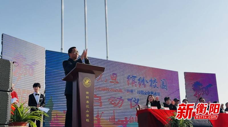 在熱烈的掌聲中,縣教育局黨組成員、副局長常會群宣布:"衡陽縣江山學校'快樂元旦·繽紛校園'活動周正式開幕!"禮花漫天,彩旗飄揚,全場響起雷鳴般的掌聲。