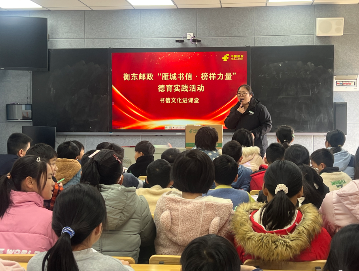 衡陽新聞網訊 通訊員龍張婷 記者趙福中報道 1月8日上午,衡東縣郵政分公司甘溪支局的工作人員走進甘溪鎮前進完小,開展主題為“雁城書信·榜樣力量”的德育實踐活動。活動從一堂生動鮮活的“書信課”展開,將書信文化、集郵知識與感恩教育深度融合,為孩子們送上一場兼具知識與溫度的郵政文化盛宴,以此表達對鄉村兒童的關愛之情。