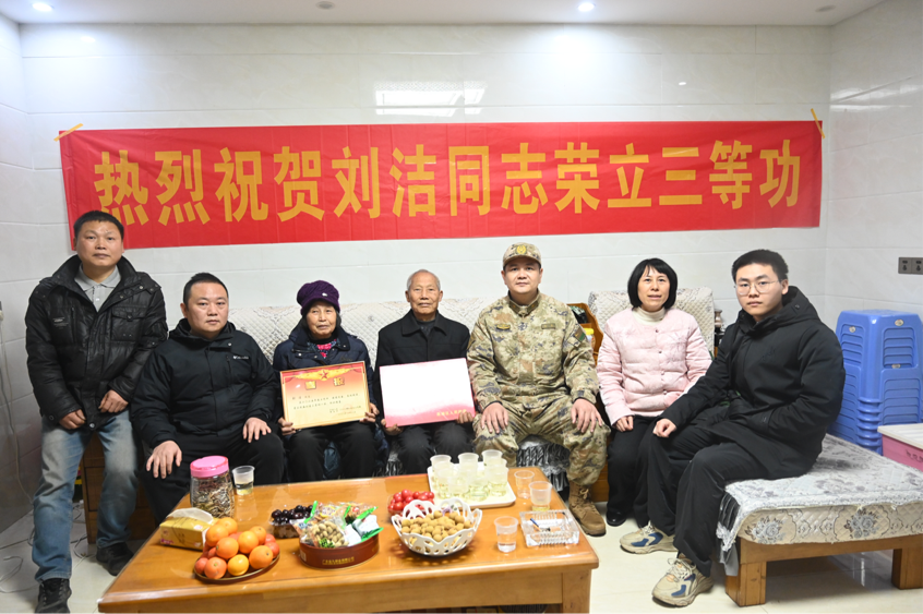 衡陽新聞網訊 通訊員胡會川報道 春節前夕,衡陽市蒸湘區冠都現代城內喜氣盈門——現役軍人劉潔在部隊榮立三等功的喜訊傳來。2月5日上午,衡陽市蒸湘區人武部聯合該區退役軍人事務局,將立功喜報、獎金送到劉潔家中,交到其父母手中。