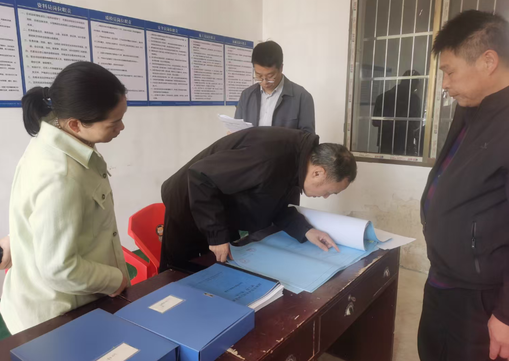 ▲檢查組詳細了解小型水庫防汛責任人落實公示情況