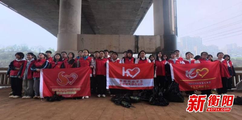 活動間隙,志愿者們在橋梁下整齊列隊,高舉“衡陽市中學生志愿服務聯合總隊”“衡陽市實驗中學學生志愿服務隊”旗幟與“‘河’我一起·保護母親河”橫幅合影留念,定格下青春與責任的美好瞬間。