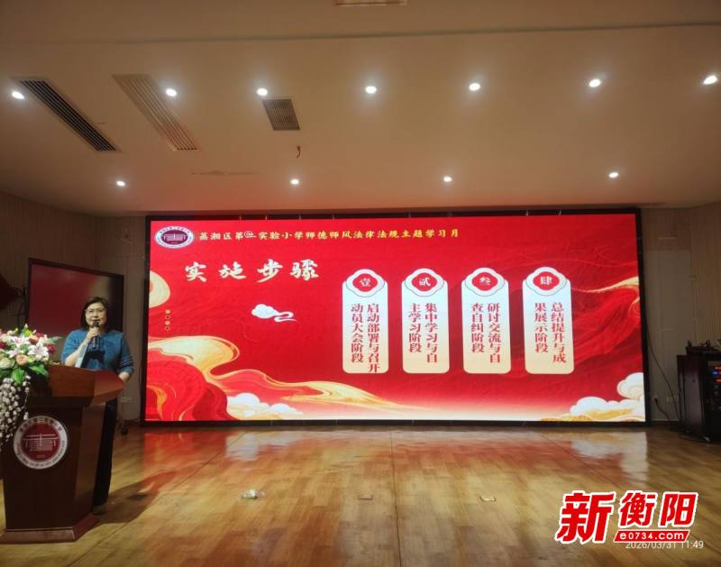 衡陽新聞網訊 通訊員陳瑾 吳曉宏 劉俊廷報道 為深入貫徹落實蒸湘區教育局師德師風建設工作要求,強化全體教職工法治意識與師德素養,筑牢教育初心,3月30日下午,蒸湘區第二實驗小學在學校多功能廳召開師德師風法律法規主題學習月動員大會。全體教職工齊聚一堂,共同開啟為期一個月的師德師風法律法規學習提升之旅。