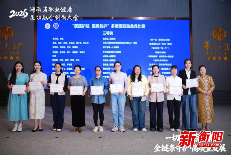 衡陽新聞網訊 通訊員陳穎 鄒勇報道 4月9日,“2026湖南省首屆職業健康醫防融合創新大會——醫路護航·現場救護多情景聯動急救比賽”在長沙圓滿落幕。衡陽市第一人民醫院兩支參賽團隊憑借過硬的專業素養、創新的科普形式與默契的團隊協作,在54個優秀作品中脫穎而出,分別榮獲一等獎和三等獎。